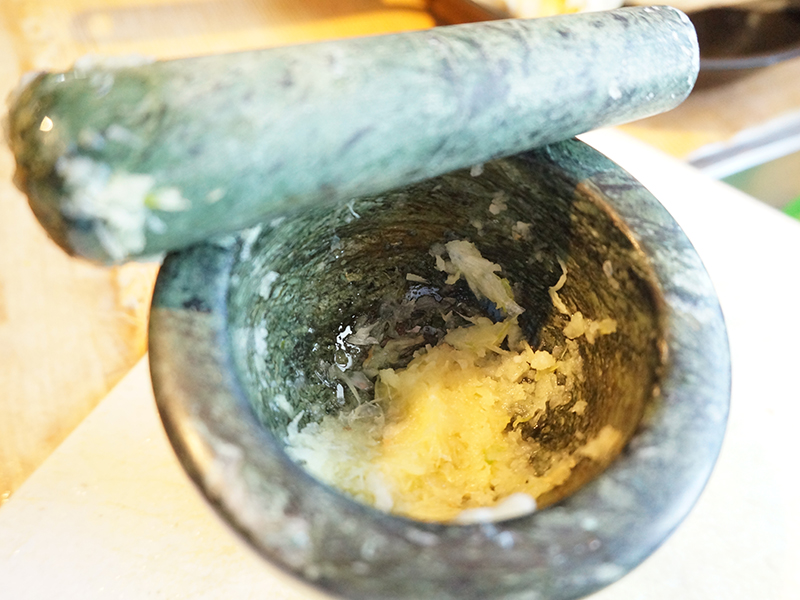 Ginger/Garlic Published December 13, 2014, 22:43 at 800 × 600 in Chholar Dal (Indian Home Cooking Week 1) ← Previous Next → I pound the ginger and garlic together in a mortar–crushing them but stopping short of making a paste. There’s no reason you shouldn’t make a paste if you don’t have a mortar and pestle, but please do not use commercial ginger and/or garlic pastes.