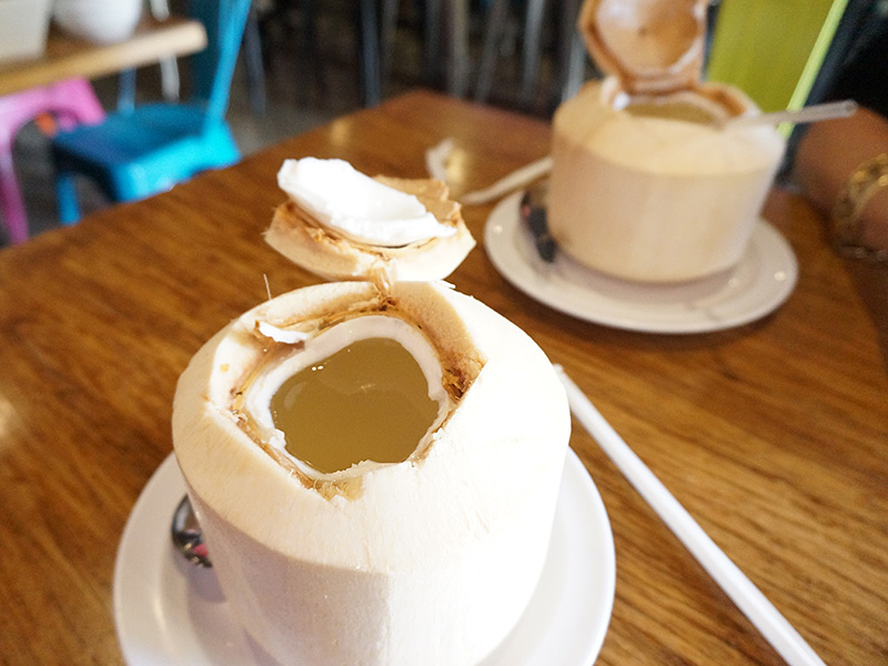 Isaan Station: Young Coconut Published January 12, 2015, 8:42 at 800 × 600 in Isaan Station, Twice (Los Angeles, Winter 2014/2015) ← Previous Next → Chilled young coconut water is the perfect antidote for very hot food; and the soft meat scooped out at the end is a nice dessert. At $4.50 a pop, not cheap though.