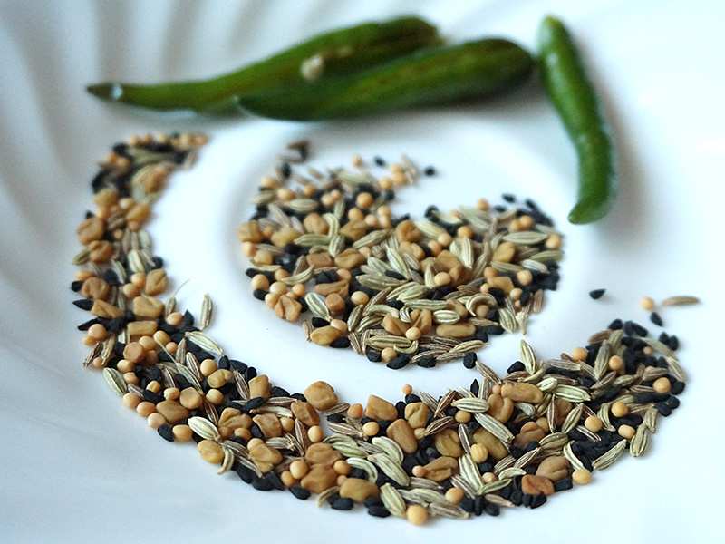 Panch Phoron and Green Chillies Published January 21, 2015, 19:50 at 800 × 600 in Shorshe-bata Maach/Fish in Mustard Paste (Indian Home Cooking Week 2) ← Previous Next → A lot of people use only kalonji (nigella seeds); my stock was very old and so I went with panch phoron.