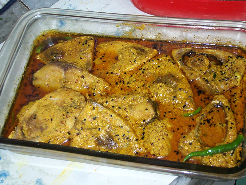 Shorshe Ilish Published January 21, 2015, 19:50 at 800 × 600 in Shorshe-bata Maach/Fish in Mustard Paste (Indian Home Cooking Week 2) ← Previous Next → Just to torture myself here is a large platter of shorshe ilish made by my mother when I was in Delhi last year. Note just how much more oil there is here (though, to be fair, ilish is an oily fish); also note that she uses kalonji alone.