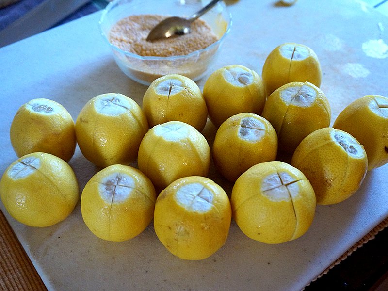 Slit Lemons Published January 23, 2015, 10:40 at 800 × 600 in Lime/Lemon Pickle (Indian Home Cooking Week 2) ← Previous Next → Lemons, thoroughly dried, slit and ready to be stuffed.