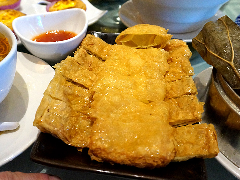 Lunasia: Deep-Fried Bean-Curd Skin Wrap Published February 18, 2015, 18:08 at 800 × 600 in Dim Sum at Lunasia (Los Angeles, Winter 2014/2015) ← Previous Next → Ditto for this deep-fried beancurd thingy. At this point we had so much food on the table that I was losing sight of some of it after photographing it.