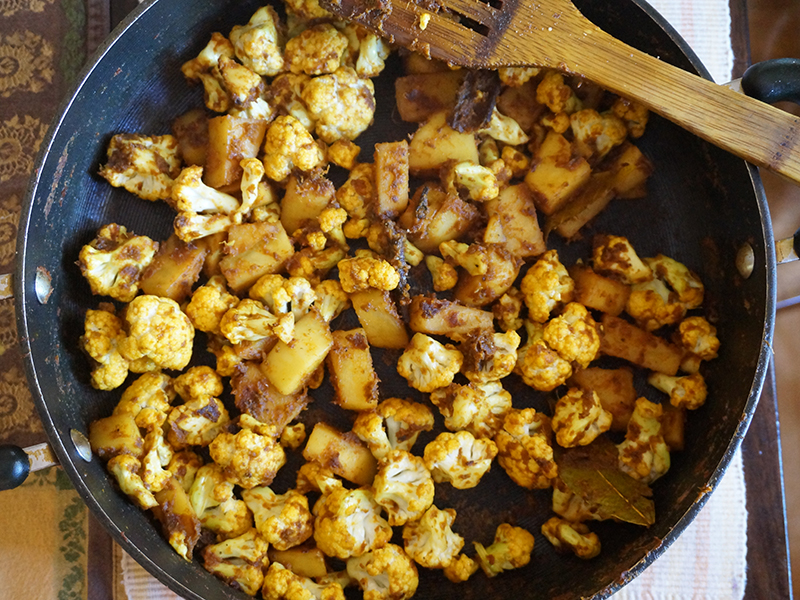 Before the tomatoes go in Published August 27, 2015, 9:23 at 800 × 600 in Shrimp Curry with Cauliflower and Potatoes ← Previous Next → You want the contents of the pan to be pretty dry at the end of every step before the water goes in.