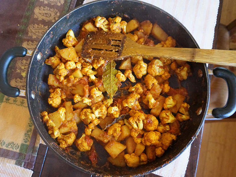 Tomatoes cooked down Published August 27, 2015, 9:23 at 800 × 600 in Shrimp Curry with Cauliflower and Potatoes ← Previous Next → Well, you’re not going to get it dry after adding the tomatoes but cook them down thoroughly before adding water.