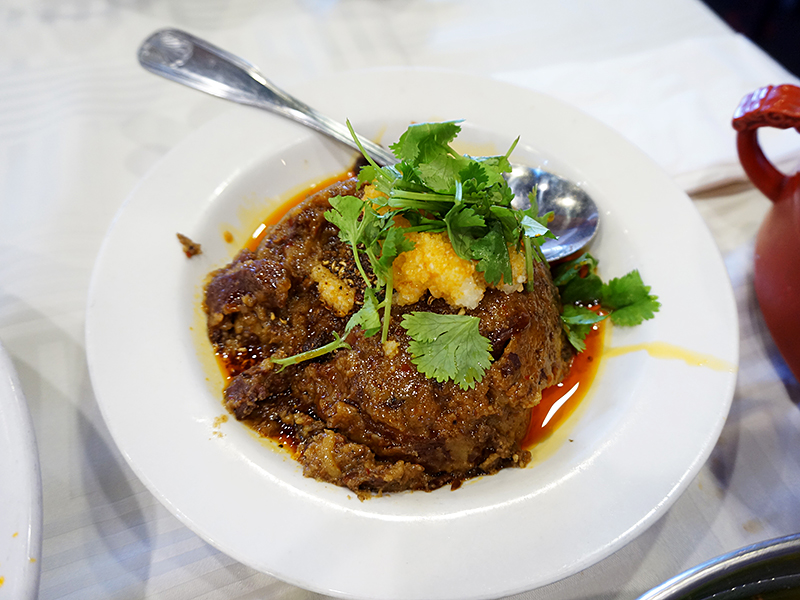 They were out of the pork version but I can’t imagine it can be very much better than the beef. The beef is more pulverized than ground and mixed with flour and steamed. Deceptively hot in the way of the best hot dishes in any cuisine—you don’t realize your mouth is on fire till you breathe out and the heat is still not the main story.