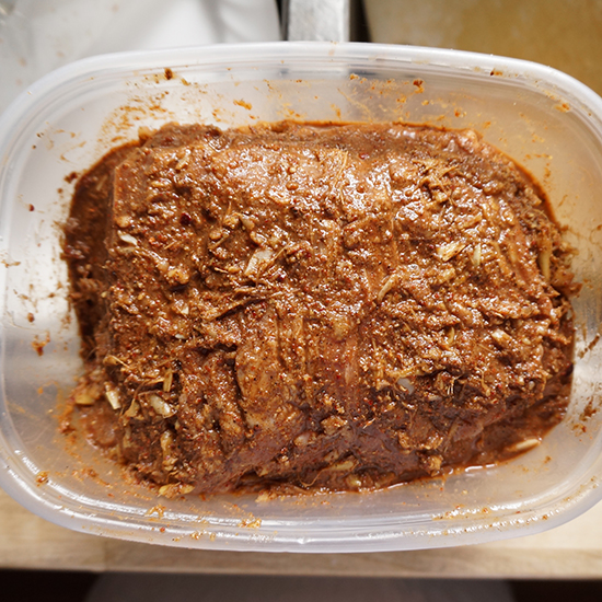 Smeared Paste Published September 7, 2015, 22:46 at 550 × 550 in Roasted Pork Shoulder with a Masala Rub ← Previous Next → And you rub the paste over the pork and into the slits (ideally while saying this aloud in your best Buffalo Bill voice).
