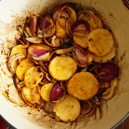 In the Pot Published September 7, 2015, 22:45 at 550 × 550 in Roasted Pork Shoulder with a Masala Rub ← Previous Next → This was midway through the roasting. I’ve rolled the onions and potatoes around in the lovely sludge and the roast is about to go back on top.