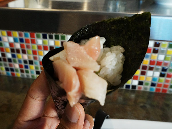Kyatchi: Hamachi Handroll Published September 10, 2015, 9:47 at 600 × 450 in Kyatchi (Minneapolis) ← Previous Next → I asked if they had handrolls and was told they make them at the bar if asked. I asked for one with hamachi and scallions and it was quite good–and the rice was much better.