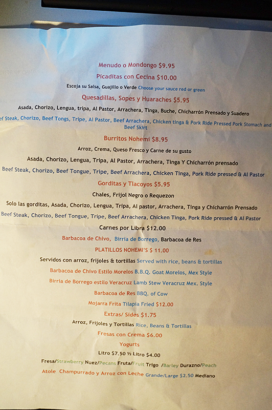 La Huasteca: Paper Menu Published November 16, 2015, 23:38 at 532 × 800 in La Huasteca (Minneapolis) ← Previous The second side, however, lists a lot more that’s not on the website or the large menu on the wall behind the cashier.