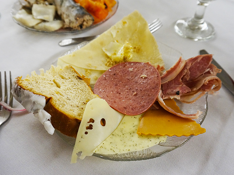 Very good summer sausage and rullepølse (this is a stuffed, rolled, boiled, cooled and sliced beef thingy). The orange’ish cheese is the Gjetost, very close to fudge. Also visible in the back is the lefse, a rather excellent think pancake that made me think “sweet rumali rotis”.