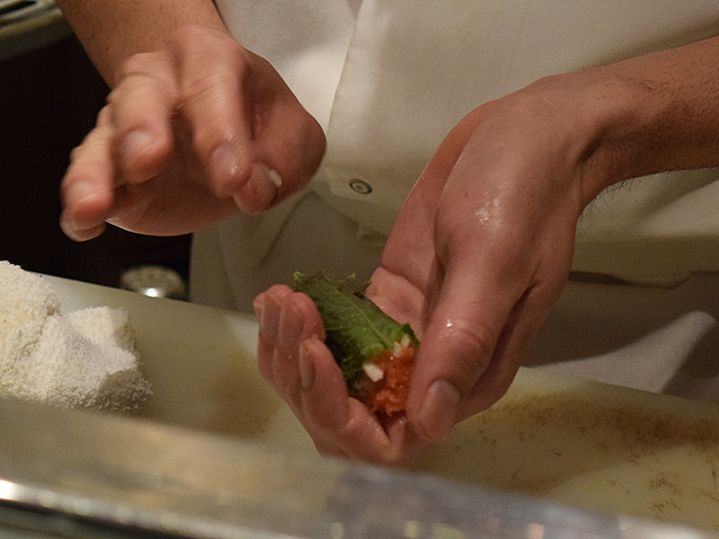 Mori Sushi: Handroll in Progress Published December 30, 2015, 23:06 at 800 × 600 in Mori Sushi (Los Angeles, Winter 2015-16) ← Previous Next → Chef Yoshi preparing the cod roe handroll.