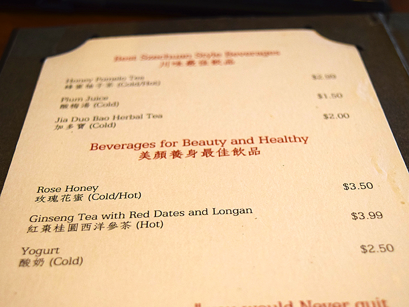 Szechuan Impression: Beauty and Healthy Published December 29, 2015, 21:04 at 800 × 600 in Szechuan Impression (Los Angeles, Winter 2015-16) ← Previous Next → We passed on these. We’re middle-aged, it’s too late for us.