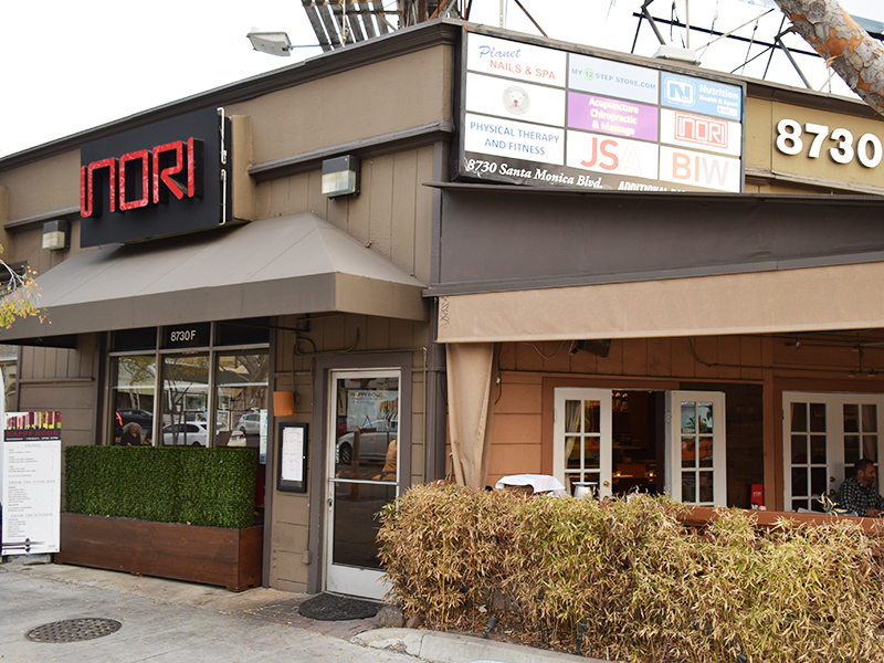 Nori: Exterior Published January 10, 2016, 4:11 at 800 × 600 in Nori (Los Angeles, Winter 2015-16) ← Previous Next → I’m not sure if there’s parking for the restaurant around the side or back—we got a meter right by it.