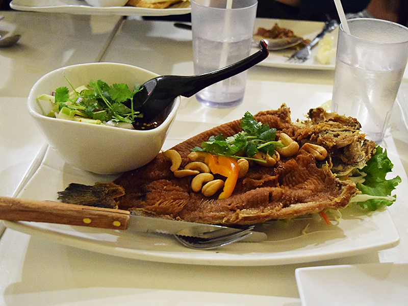 Lacha Somtum: Deep Fried Trout Published January 16, 2016, 10:29 at 800 × 600 in Lacha Somtum (Los Angeles, 2015 & 2016) ← Previous Next → This was really very nice. The trout was butterflied and perfectly crispily fried and the dipping sauce with slices of green apple was excellent.