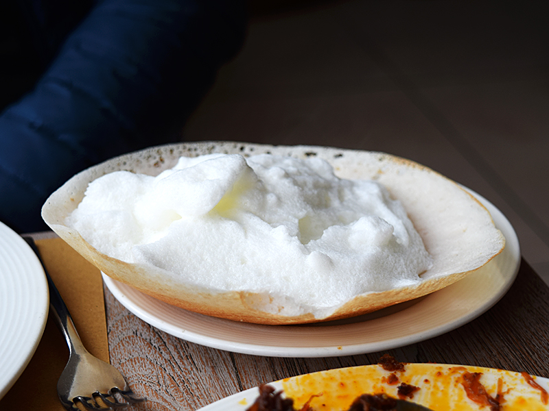 Coast Cafe: Egg White Appam Published February 1, 2016, 9:19 at 800 × 600 in Coast Cafe (Delhi, January 2016) ← Previous Next → My friend got an egg white appam. It was striking to look at and he liked it a lot but I prefer regular appams.