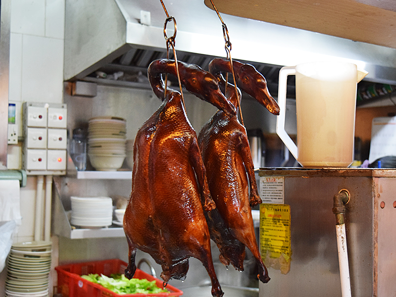 Yat Lok: Two Geese Published February 10, 2016, 22:58 at 800 × 600 in Roast Goose at Yat Lok (Hong Kong, Jan 2016) ← Previous Next → An attractive sight as we walked to our table (the geese would probably have disagreed when living).