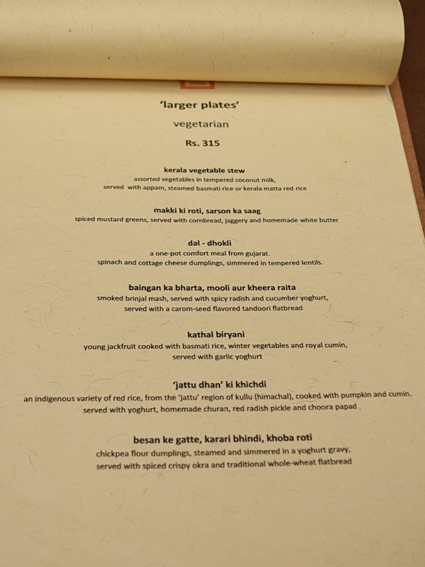 Cafe Lota: Larger Plates, Vegetarian Published February 15, 2016, 21:08 at 600 × 800 in Café Lota, Two Years Later (Delhi, January 2016) ← Previous Next → Now we move to the larger plates. First the few vegetarian things we ate. Eating out with friends affords the missus the opportunity to eat things that I refuse to eat. In this case, eggplant and jackfruit.