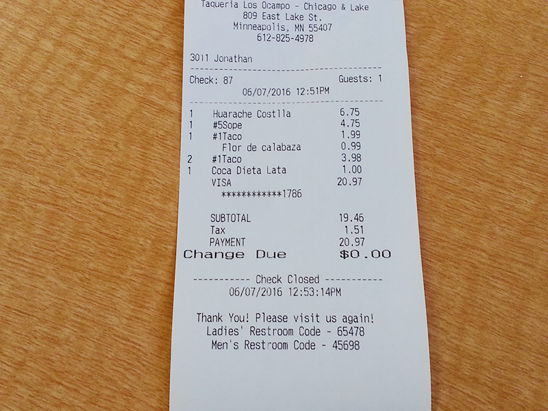 Los Ocampo: Bill Published June 9, 2016, 12:10 at 800 × 600 in Tacos etc. at Los Ocampo (Minneapolis) ← Previous Next → Like I said, it’s very cheap.