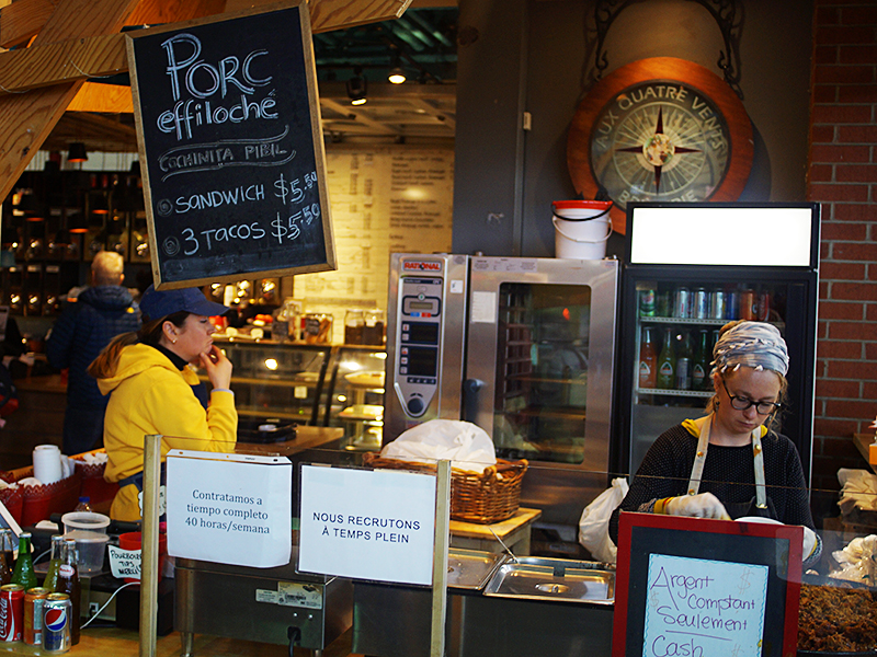Jean-Talon Market: Porc Effiloche Published November 2, 2016, 22:36 at 800 × 600 in Jean-Talon Market, Pt. 1 (Montreal) ← Previous Next → This counter was not manned by anyone who looked to be of obvious Mexican descent but was serving up pretty legit looking cochinita pibil in both taco and sandwich form.