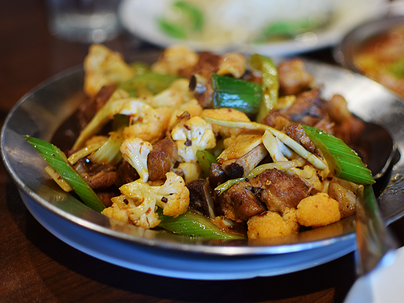 Grand Szechuan: Griddle Cooked Chicken Published December 28, 2016, 22:43 at 800 × 600 in Grand Szechuan, 2016 ← Previous Next → Another that made it to the printed menu this year, this prep of chicken with cauliflower is really very good—another dish that deploys cumin rather than dried chillies.