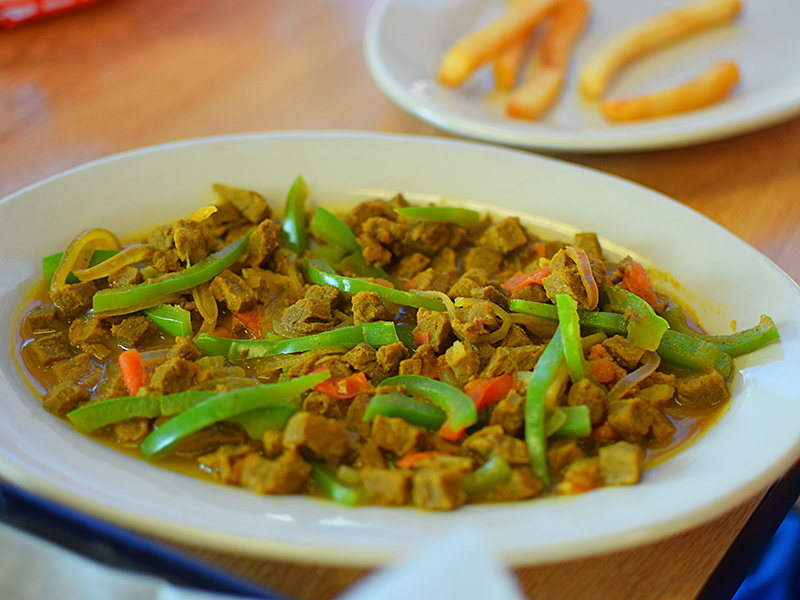 You may read this as “beef sugar” on the menu, as I did the first time I encountered it—but it’s actually a q not a g. It refers to meat cut into very tiny cubes. The beef version is very reminiscent of a mild North Indian curry. You can get it with a number of starch options.