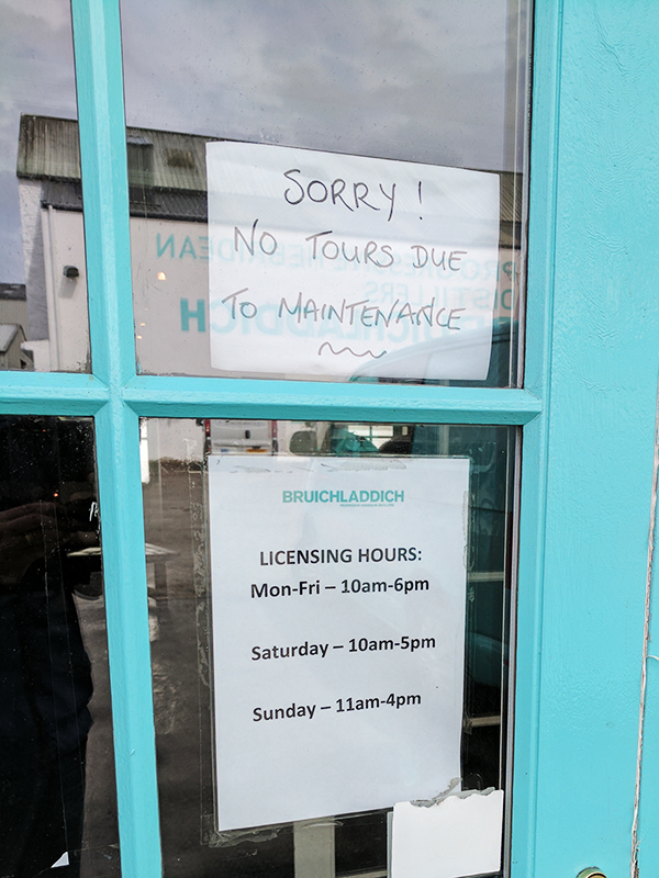 Bruichladdich: No Tours Published August 1, 2017, 20:37 at 600 × 800 in Bruichladdich, Barely (Summer 2017) ← Previous Next → Though they may of course not be offering tours when you arrive (always good to plan ahead).