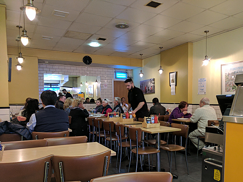 The Laughing Halibut: Tables Published August 10, 2017, 22:21 at 800 × 600 in Fish and Chips at the Laughing Halibut (London) ← Previous Next → But the bulk of the seating is further in.