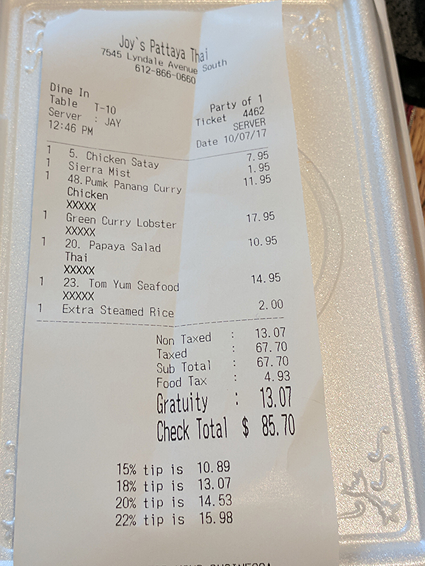 Joy’s Pattaya Thai: Bill Published October 9, 2017, 22:14 at 600 × 800 in Joy’s Pattaya Thai (Richfield, MN) Next →