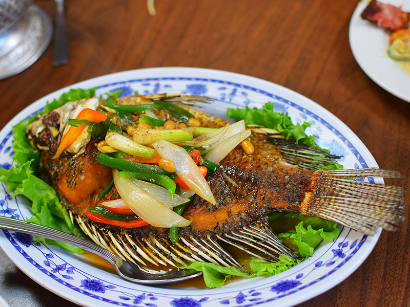 Thai Cafe: Ginger fried fish Published December 17, 2017, 21:47 at 800 × 600 in Thai Cafe (St. Paul) ← Previous Next → Whole tilapia, perfectly fried and topped with a peppery-gingery sauce. Excellent.