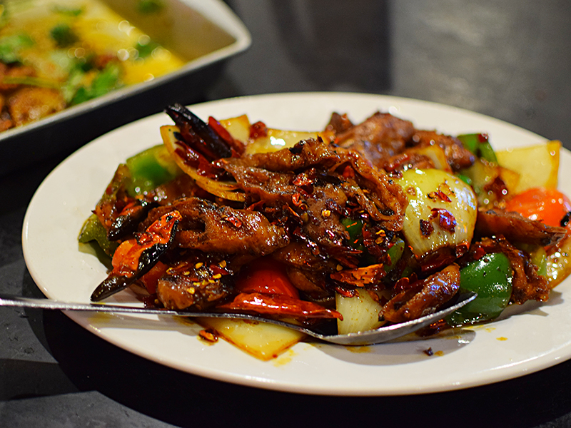 Grand Szechuan: Spicy pork intestines Published January 1, 2018, 21:22 at 800 × 600 in Grand Szechuan, 2017 (Bloomington, MN) ← Previous Next → This was rather good. Crispy on the outside and yielding on the inside, the interplay of textures was very good as was the balance of the heat and the sweetness of the sauteed onions and peppers.