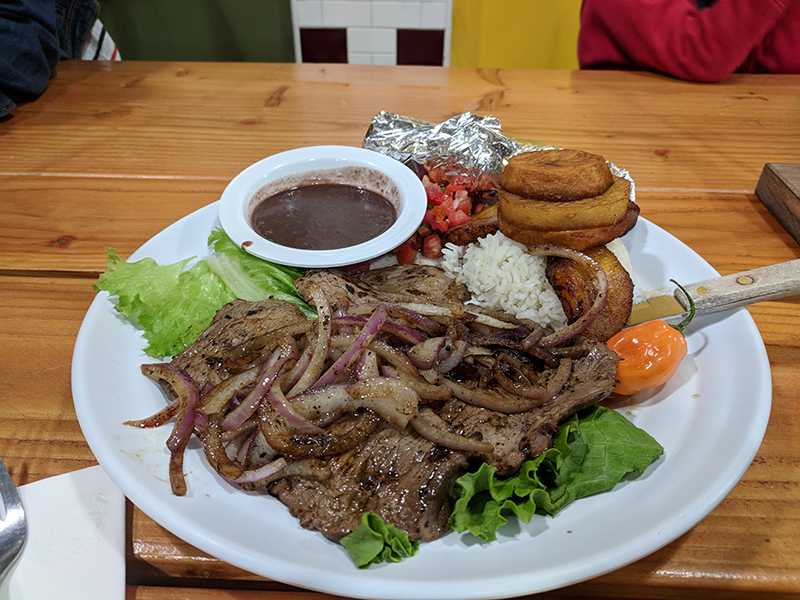 Chichen Itza: Bistec a la Yucateca Published December 25, 2017, 21:14 at 800 × 600 in Chichen Itza (Los Angeles, December 2017) ← Previous Next → Grilled steak with rice and beans (and fried plantains and potatoes). The kids went through the meat and rice and beans like so many buzz-saws.
