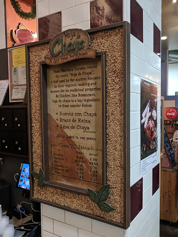 Chichen Itza: Hoja de chaya Published December 25, 2017, 21:14 at 600 × 800 in Chichen Itza (Los Angeles, December 2017) ← Previous Next → We didn’t try anything made with the chaya leaf.