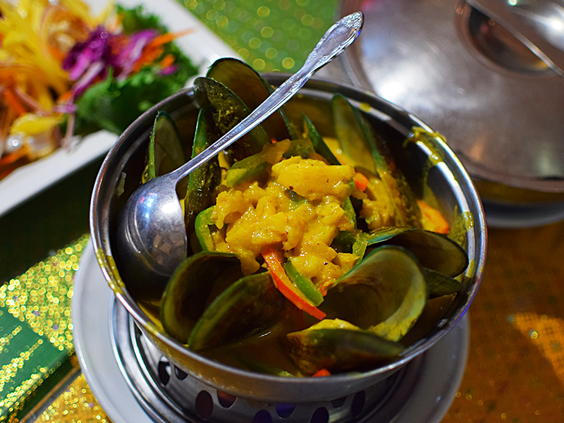 Jitlada: Southern mussels curry Published December 27, 2017, 12:11 at 800 × 600 in Jitlada II (Los Angeles, December 2017) ← Previous Next → Great plump mussels in a lovely sweet, sour and spicy curry with pineapple.