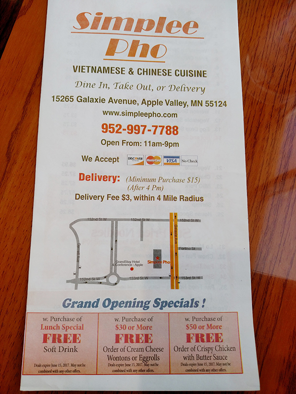 Simplee Pho: Take out menu Published May 26, 2018, 22:51 at 600 × 800 in Simplee Pho (Apple Valley, MN) ← Previous