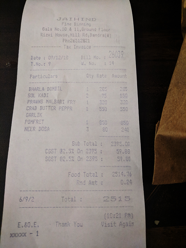 Jai Hind: Bill Published January 12, 2019, 22:47 at 600 × 800 in Jai Hind Lunch Home (Bombay, December 2018) ← Previous Next →