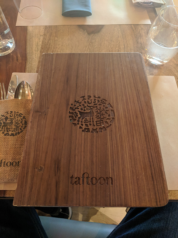 Taftoon, Menu Published March 12, 2019, 21:18 at 600 × 800 in Taftoon (Bombay, December 2018) ← Previous Next → A big menu in more ways than one.