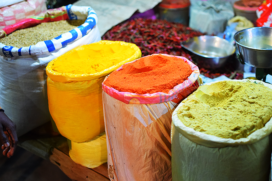 Mangal Bazar, Spices Published March 18, 2019, 20:56 at 900 × 600 in Mangal Bazar (Noida, December 2018) ← Previous Next → Turmeric, chilli powder and I’d guess ginger powder.