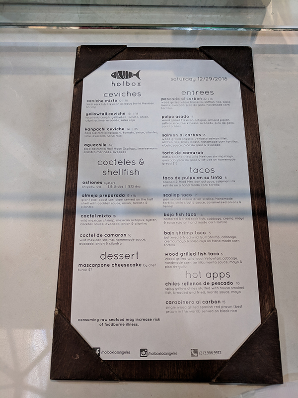 Holbox, Menu, Dec 29-2018 Published April 6, 2019, 9:17 at 600 × 800 in Holbox (Los Angeles, December 2018) ← Previous Next → The menu is not static, changing daily depending on what they’ve got in fresh.
