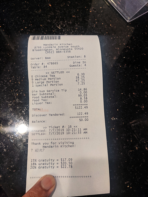 Mandarin Kitchen, Bill Published July 15, 2019, 9:42 at 600 × 800 in Dim Sum at Mandarin Kitchen (Bloomington, MN) ← Previous Next →