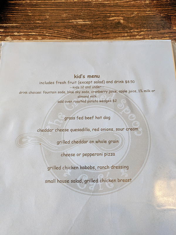 Crooked Spoon, Kids’ Menu Published July 20, 2019, 11:50 at 600 × 800 in The Crooked Spoon Cafe (Grand Marais, MN) ← Previous Next →