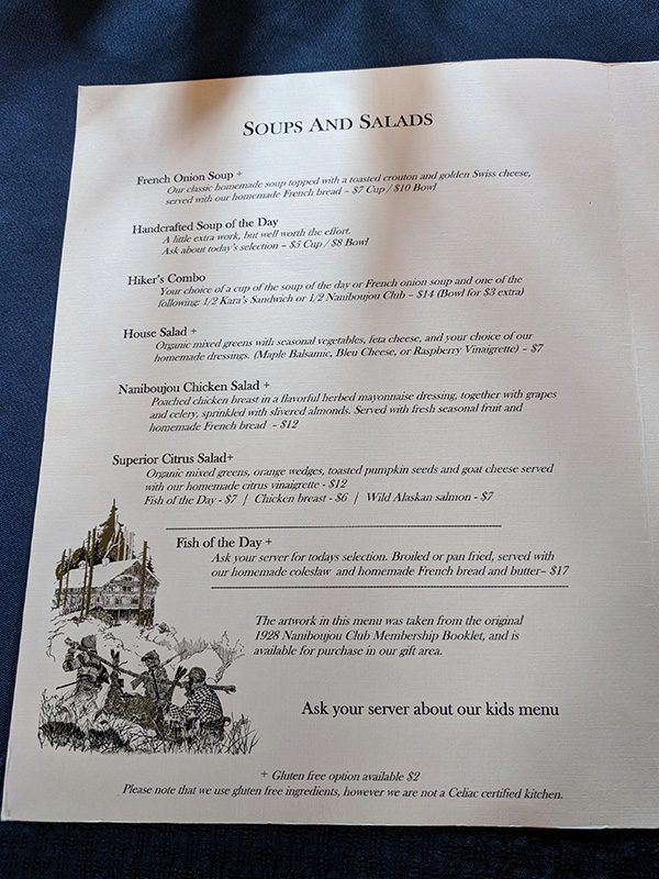 The Naniboujou Lodge, Soups and salads Published July 28, 2019, 9:57 at 600 × 800 in Lunch at the Naniboujou Lodge (Grand Marais) ← Previous Next →