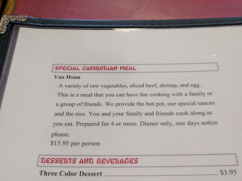 Cheng Heng, Menu, Special Cambodian Meal Published August 5, 2019, 12:03 at 800 × 600 in Cheng Heng II (St. Paul, MN) ← Previous Next → Looks like fun.