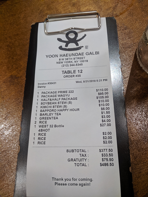 Yoon Haenundae Galbi, Bill Published September 21, 2019, 22:52 at 600 × 800 in Yoon Haeundae Galbi (New York, August 2019) ← Previous Next →