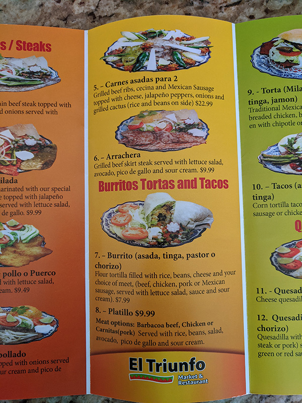 El Triunfo, Menu Published March 30, 2020, 21:48 at 600 × 800 in Pandemic Takeout 01: El Triunfo (Northfield, MN) ← Previous Next →