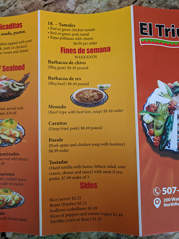 El Triunfo, Menu Published March 30, 2020, 21:48 at 600 × 800 in Pandemic Takeout 01: El Triunfo (Northfield, MN) ← Previous Next →