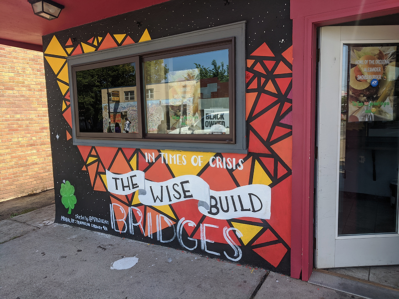Smoke in the Pit, The Wise Build Bridges Published July 21, 2020, 21:10 at 800 × 600 in Pandemic Takeout 16: Smoke in the Pit (Minneapolis) ← Previous Next →