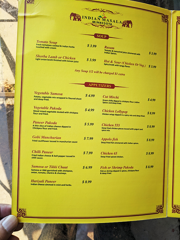 Indian Masala, Menu, Soup,, Appetizers Published November 1, 2020, 19:28 at 600 × 800 in Pandemic Takeout 31: Indian Masala (Maplewood, MN) ← Previous Next →