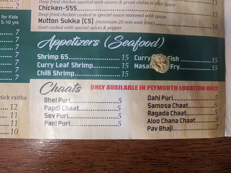 Hyderabad House, Menu, Appetizers-Seafood, Chaat Published November 29, 2020, 13:53 at 800 × 600 in Pandemic Takeout 35: Hyderabad House (Plymouth, MN) ← Previous Next →