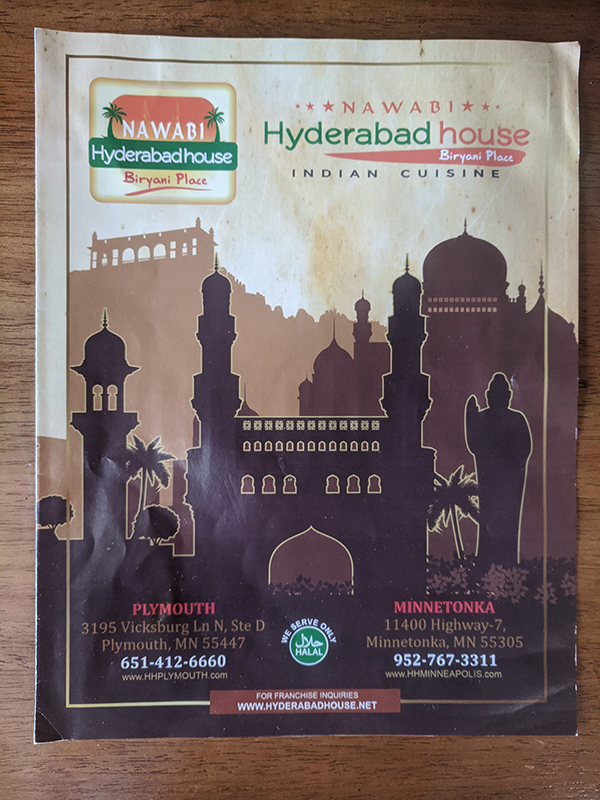 Hyderabad House, Menu Published November 29, 2020, 13:53 at 600 × 800 in Pandemic Takeout 35: Hyderabad House (Plymouth, MN) ← Previous Next →