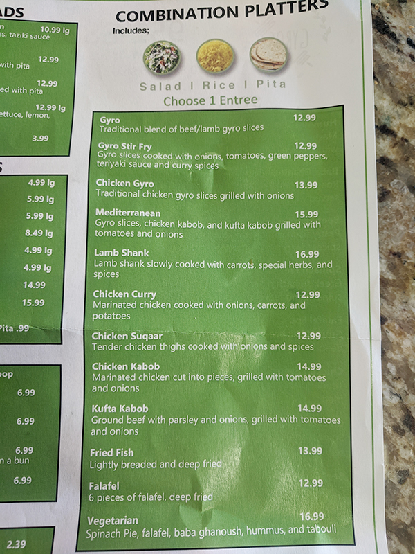 Gyros Grill, Menu, Combination Platters Published March 8, 2021, 20:15 at 600 × 800 in Pandemic Takeout 48: Gyros Grill (Bloomington, MN) ← Previous Next →